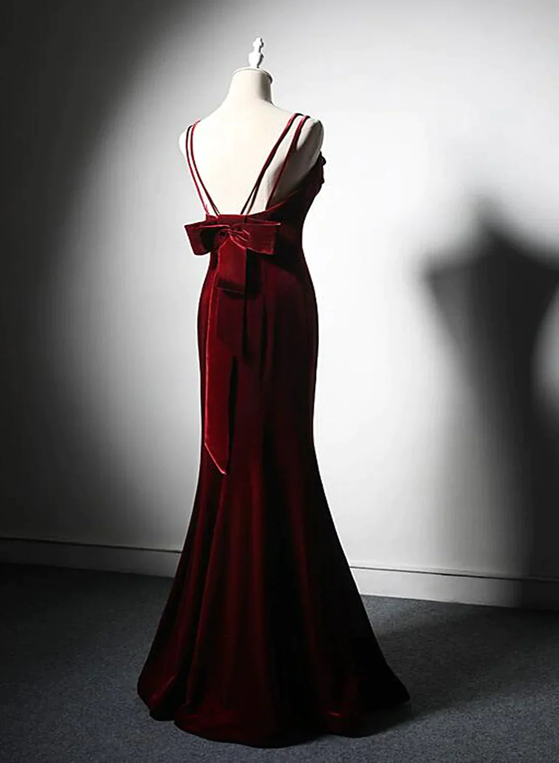 Wine Red Low Back Mermaid Formal Dress, Velvet Straps Long Prom Dress