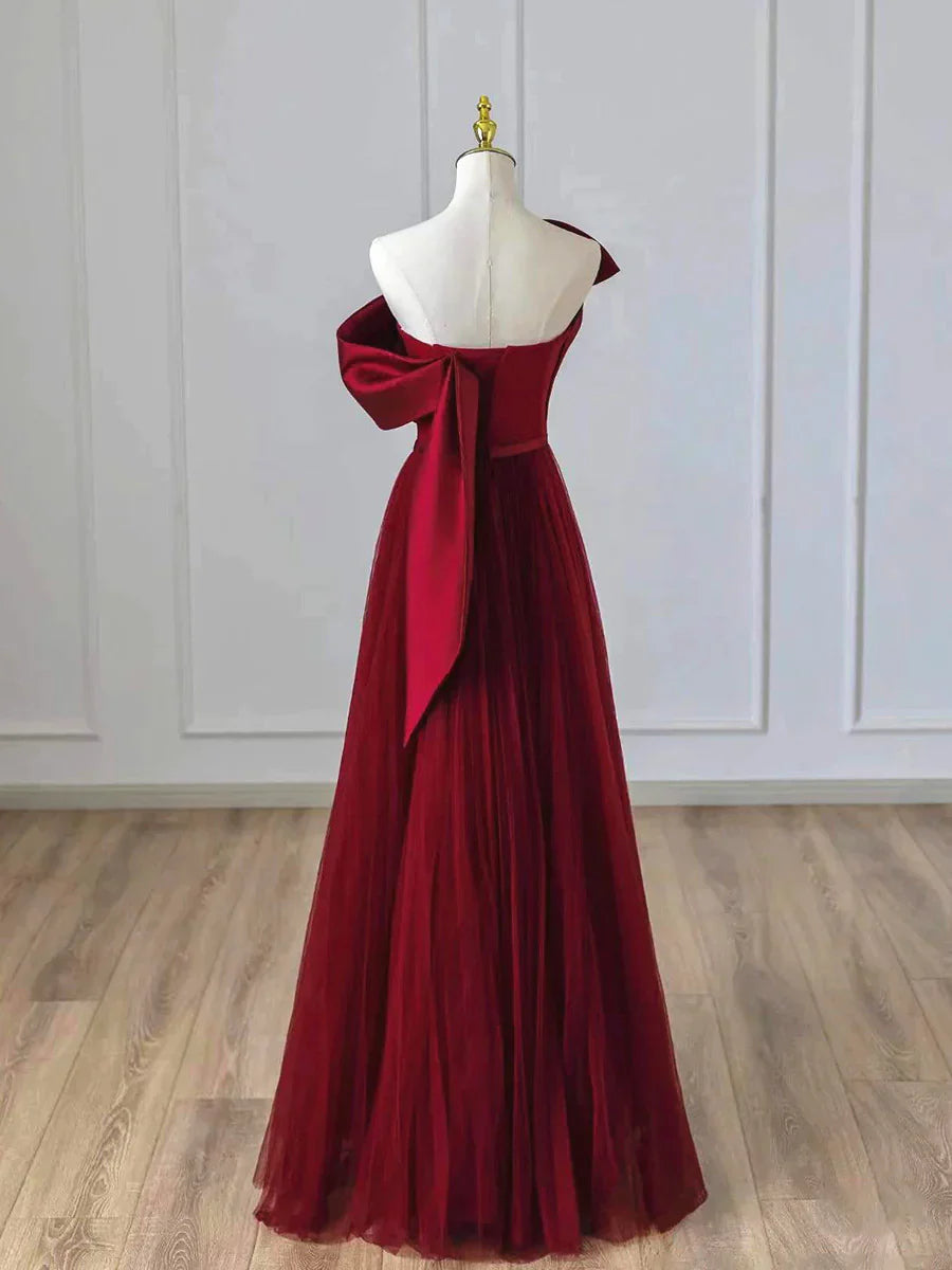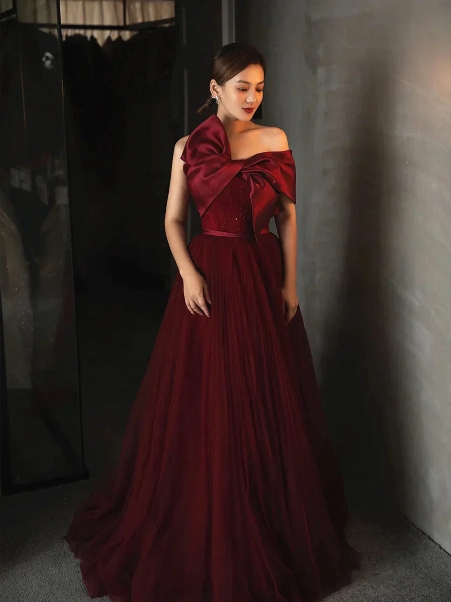 Wine Red Satin and Tulle A-line Simple Prom Dress, Floor Length Party Dress