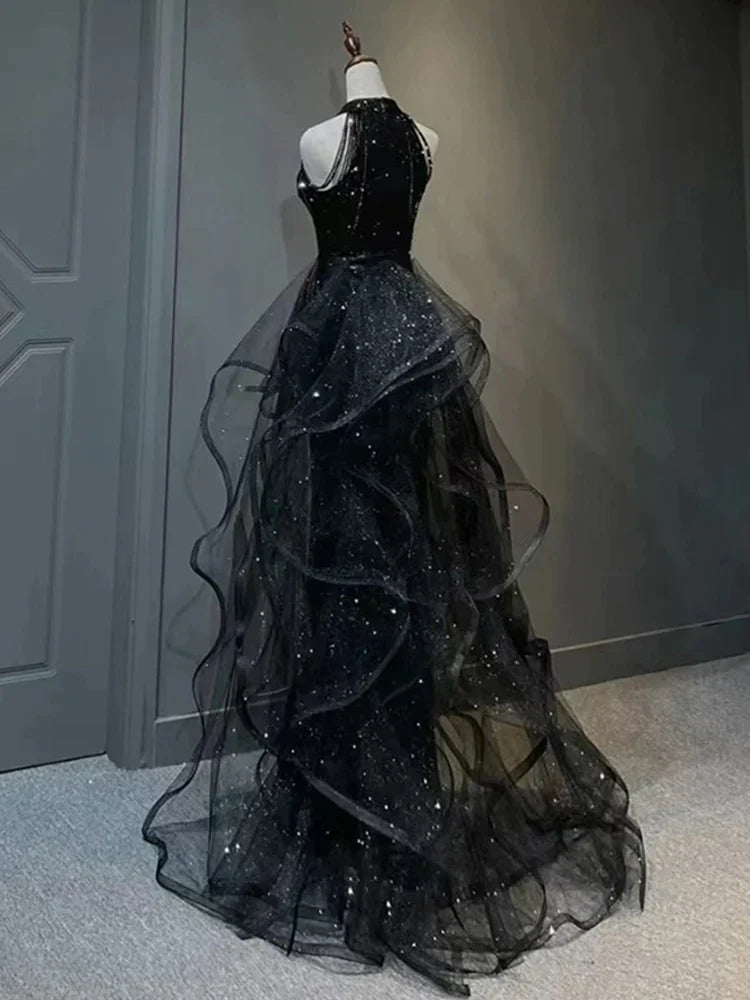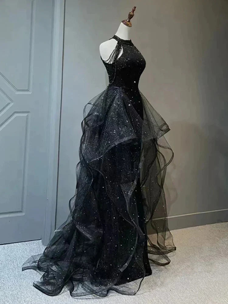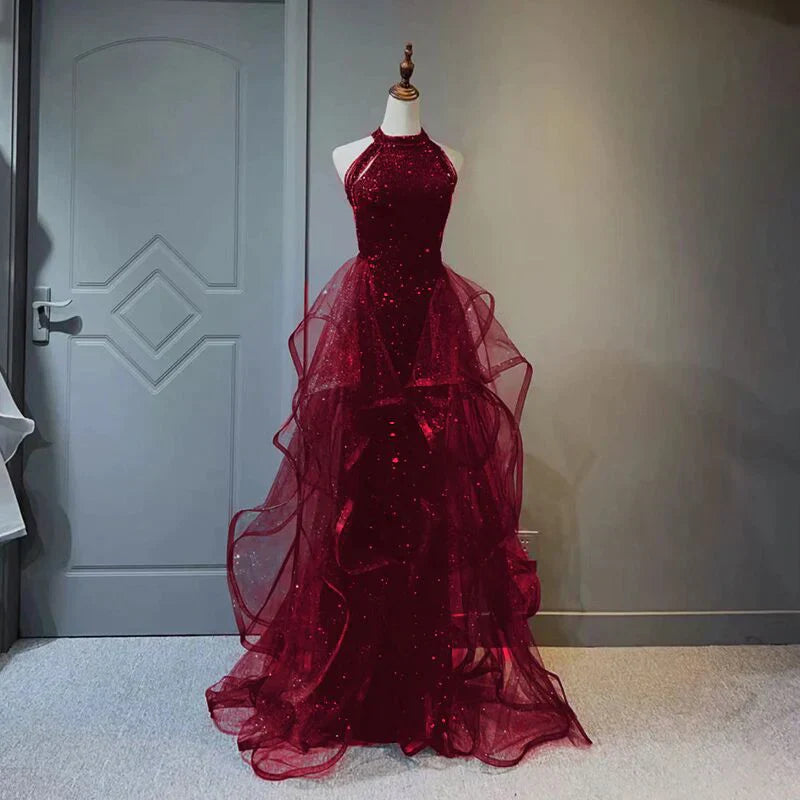 Wine Red Sequins and Tulle Halter Long Prom Dress, Wine Red Evening Dress