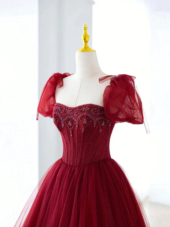 Wine Red Short Sleeves Beaded Long Prom Dress, Wine Red Sweetheart Party Dress